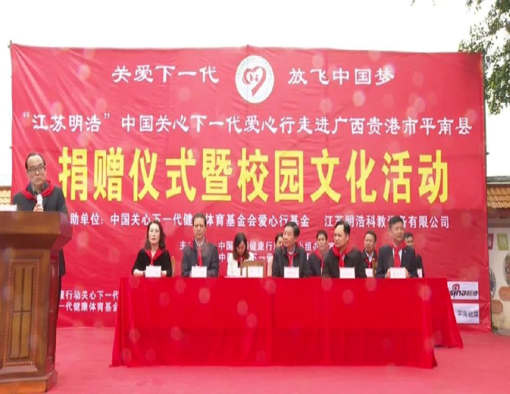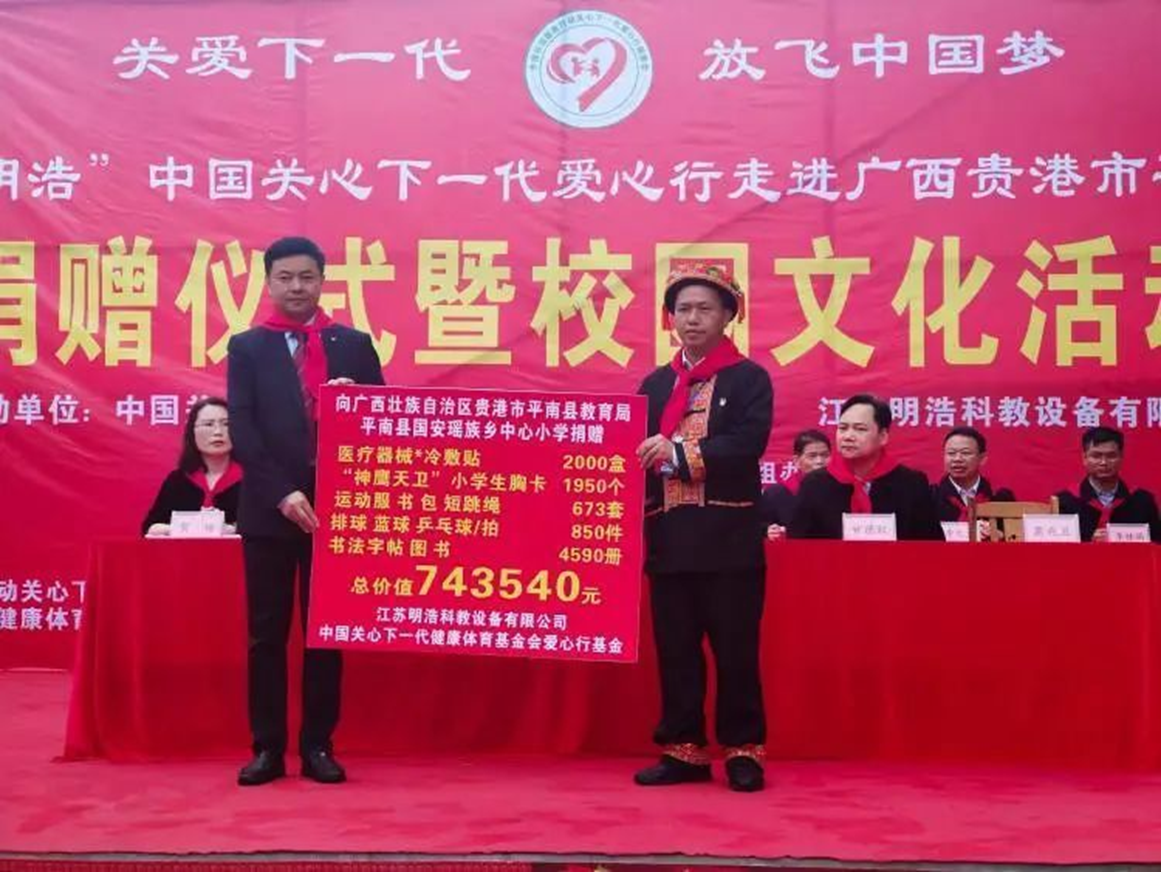 活动中,江苏明浩科教设备有限公司向县教育局、国安瑶族乡中心小学捐赠总价值743540元的“神鹰天卫”文体用品,包括小学生胸卡、运动服、书包、短跳绳、排球、蓝球、乒乓球拍、书法字帖、图书等。中国关心下一代健康体育基金会向江苏明浩科教设备有限公司颁发捐赠证书。潘燕艳向江苏明浩科教设备有限公司送上锦旗。